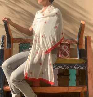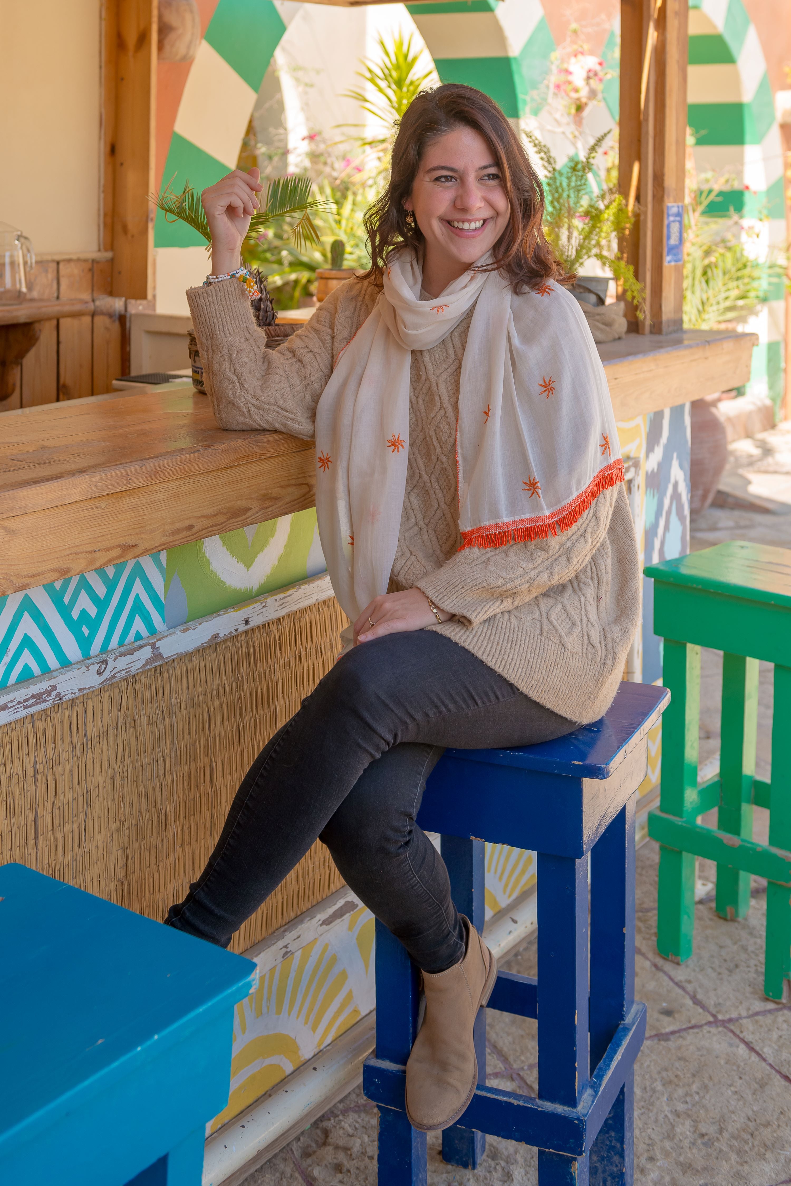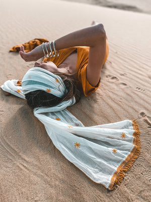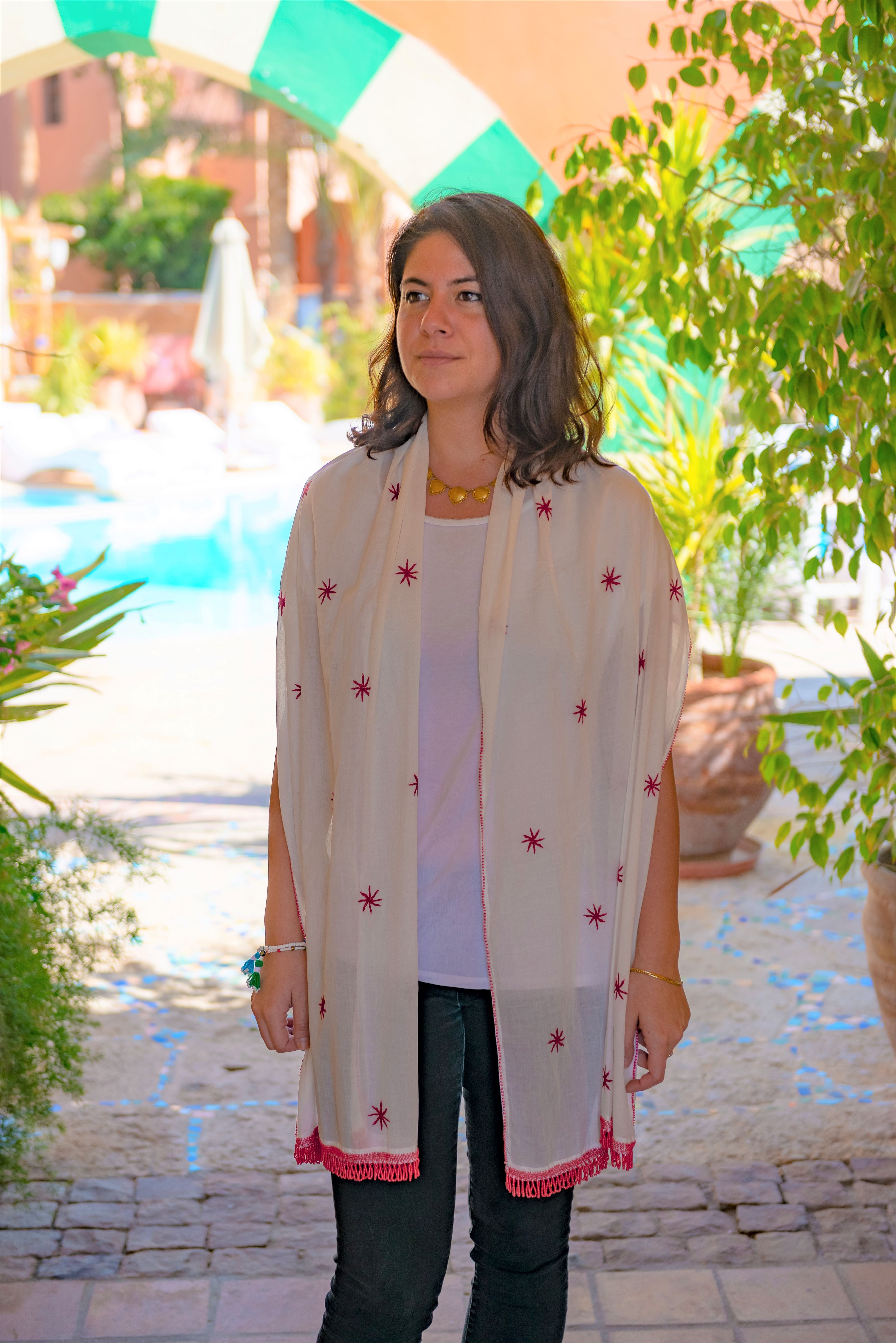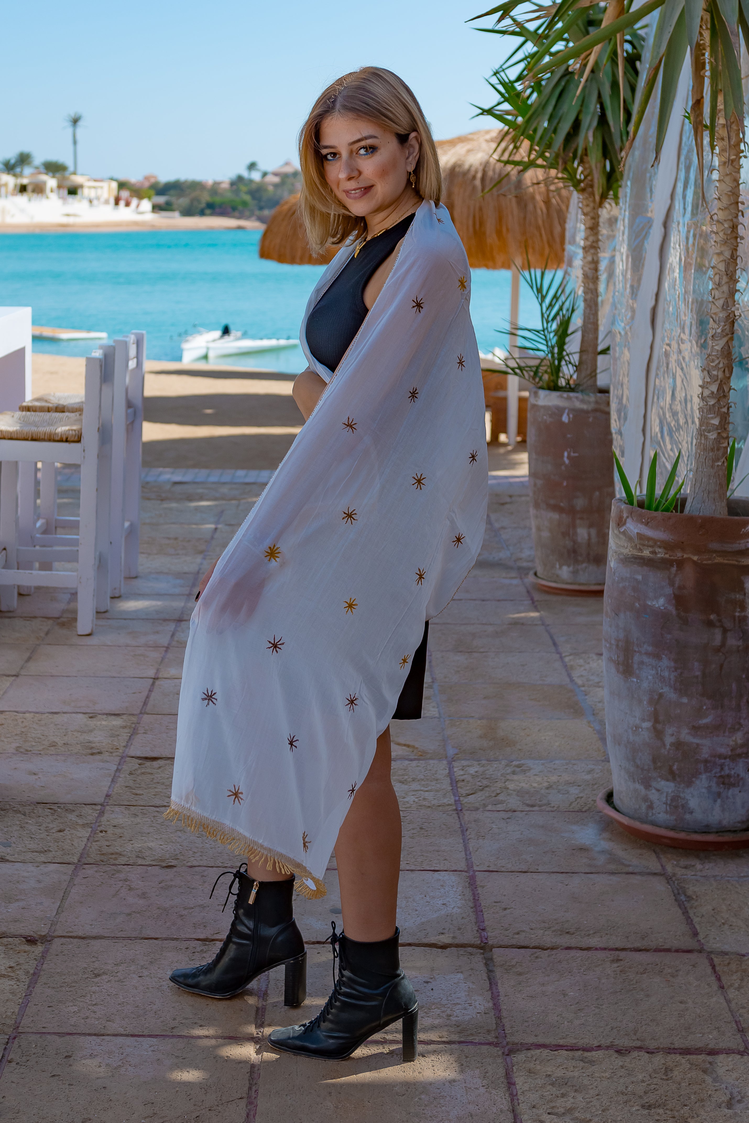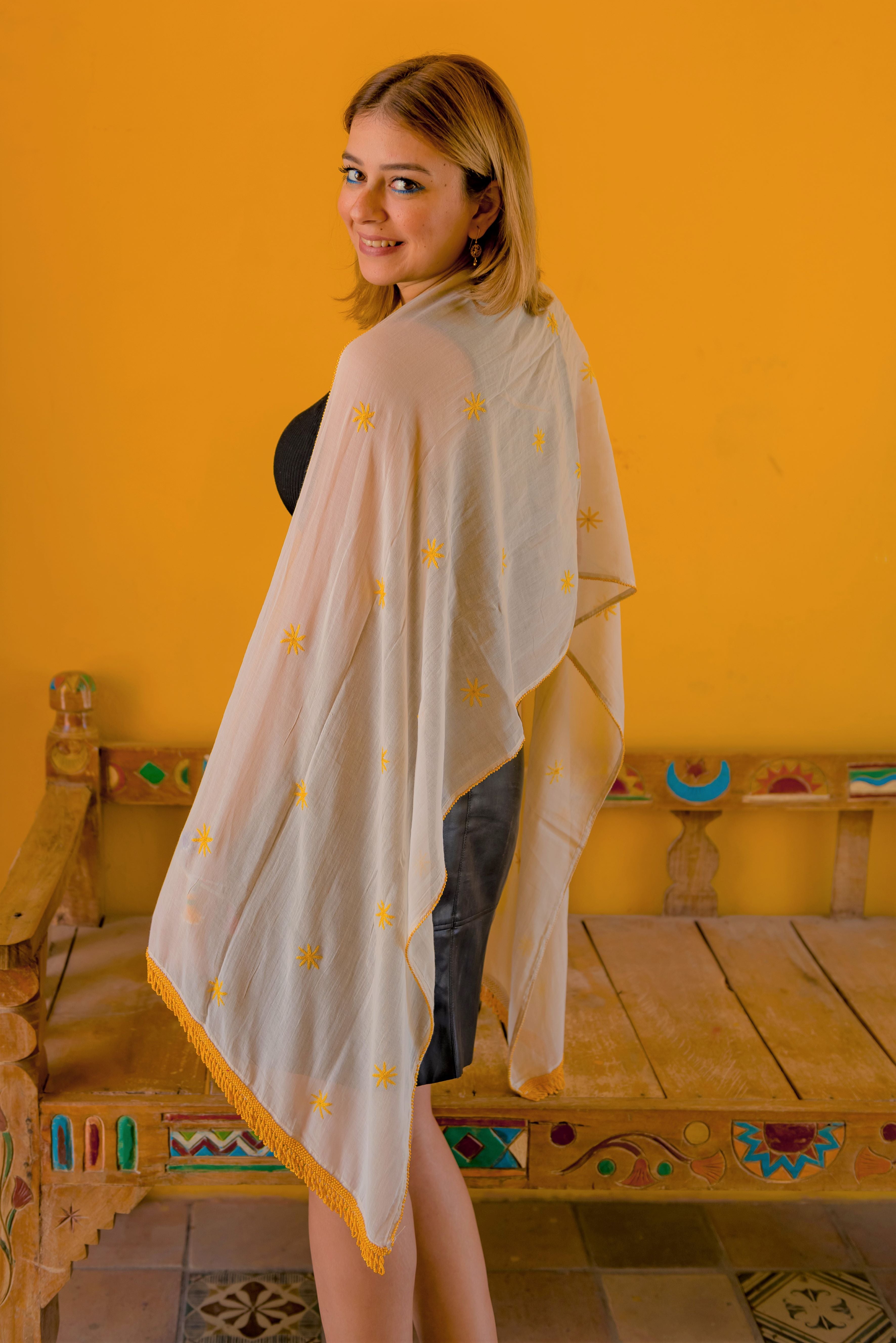 This subtle and graceful scarf can enhance a simple day or evening look. The Salha scarf is made by women in Sinai. They combine traditional beadwork with contemporary hand embroidery of a stars design.