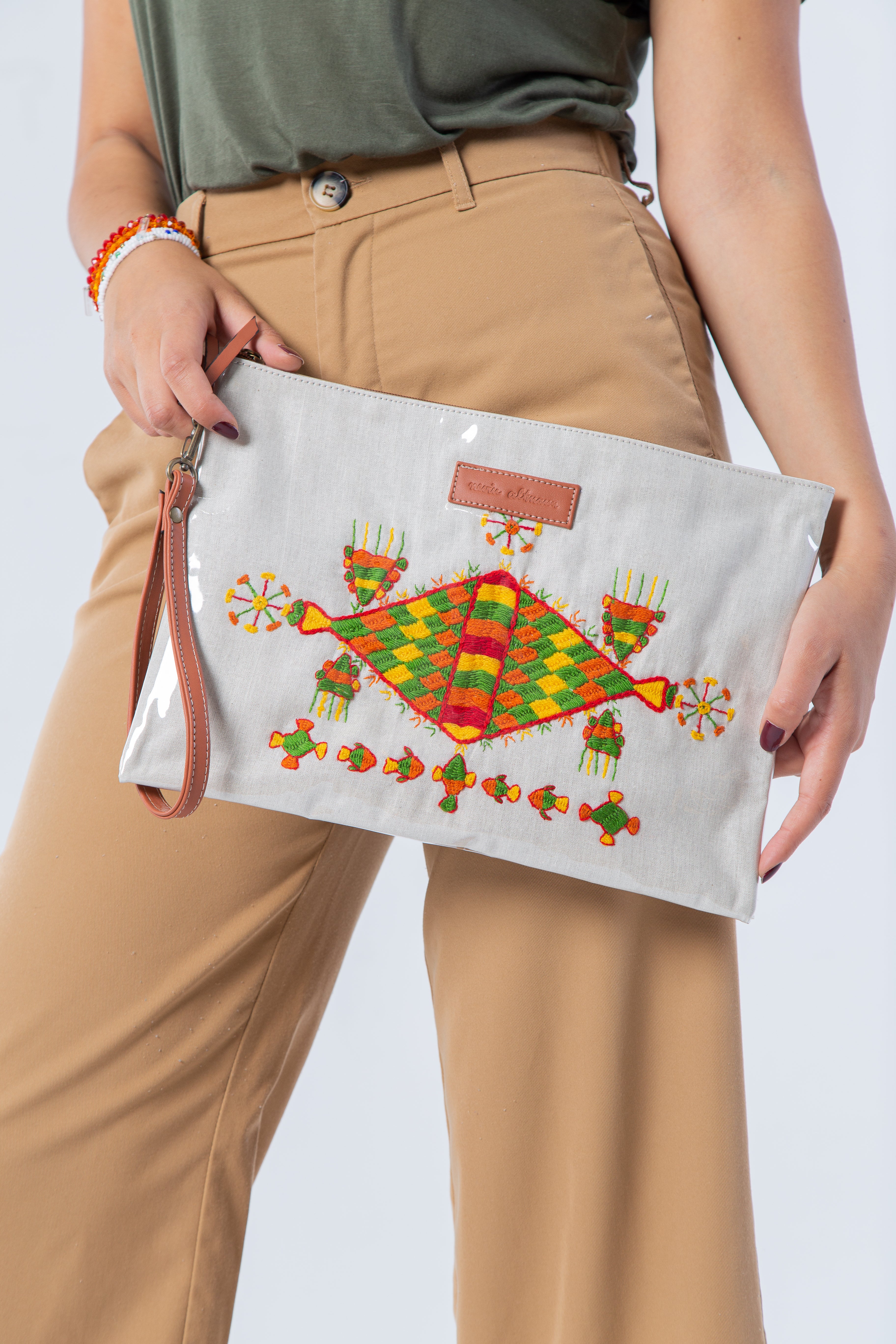 Traditional Hand Embroidery from Siwa on cotton covered in plastic with a vegan leather handle.