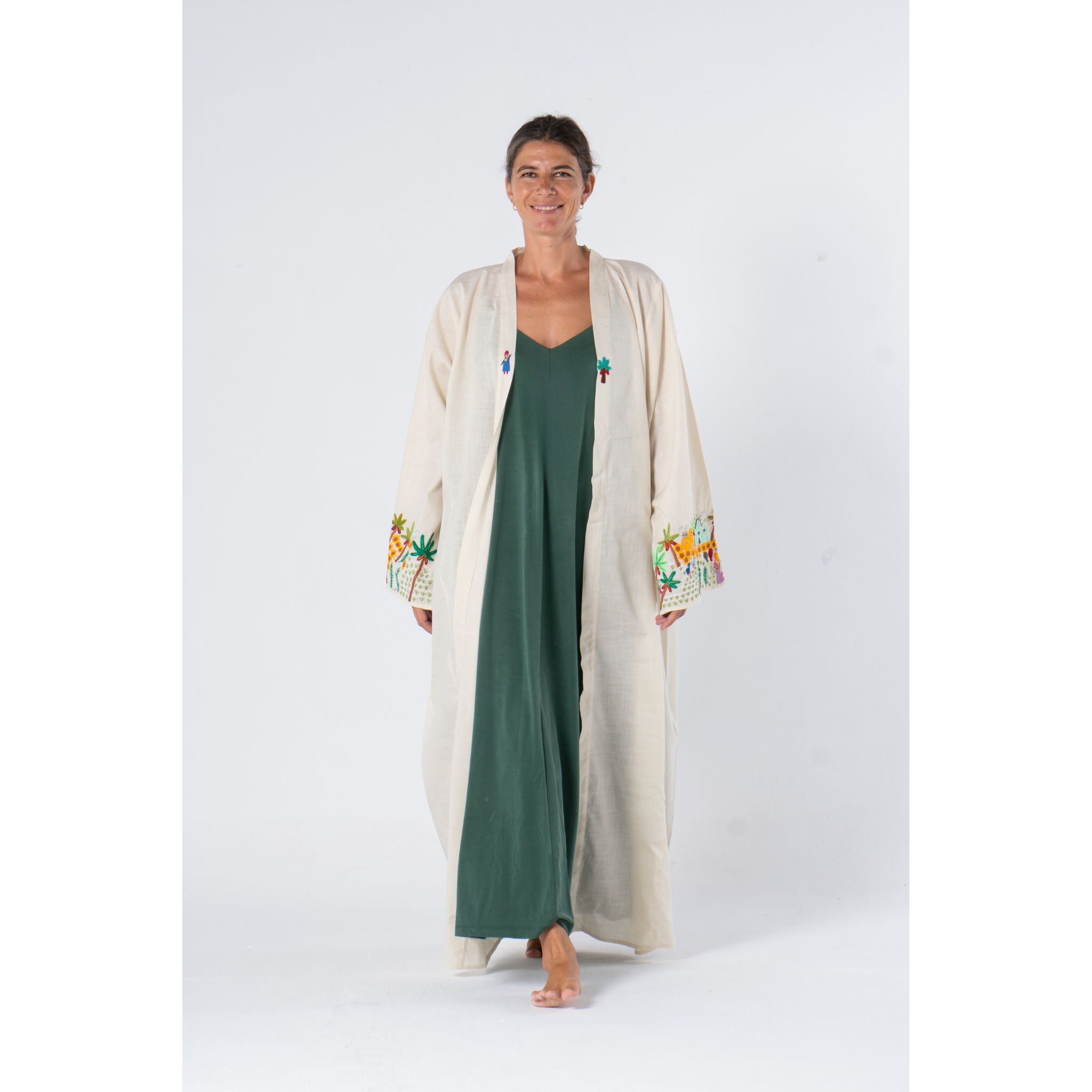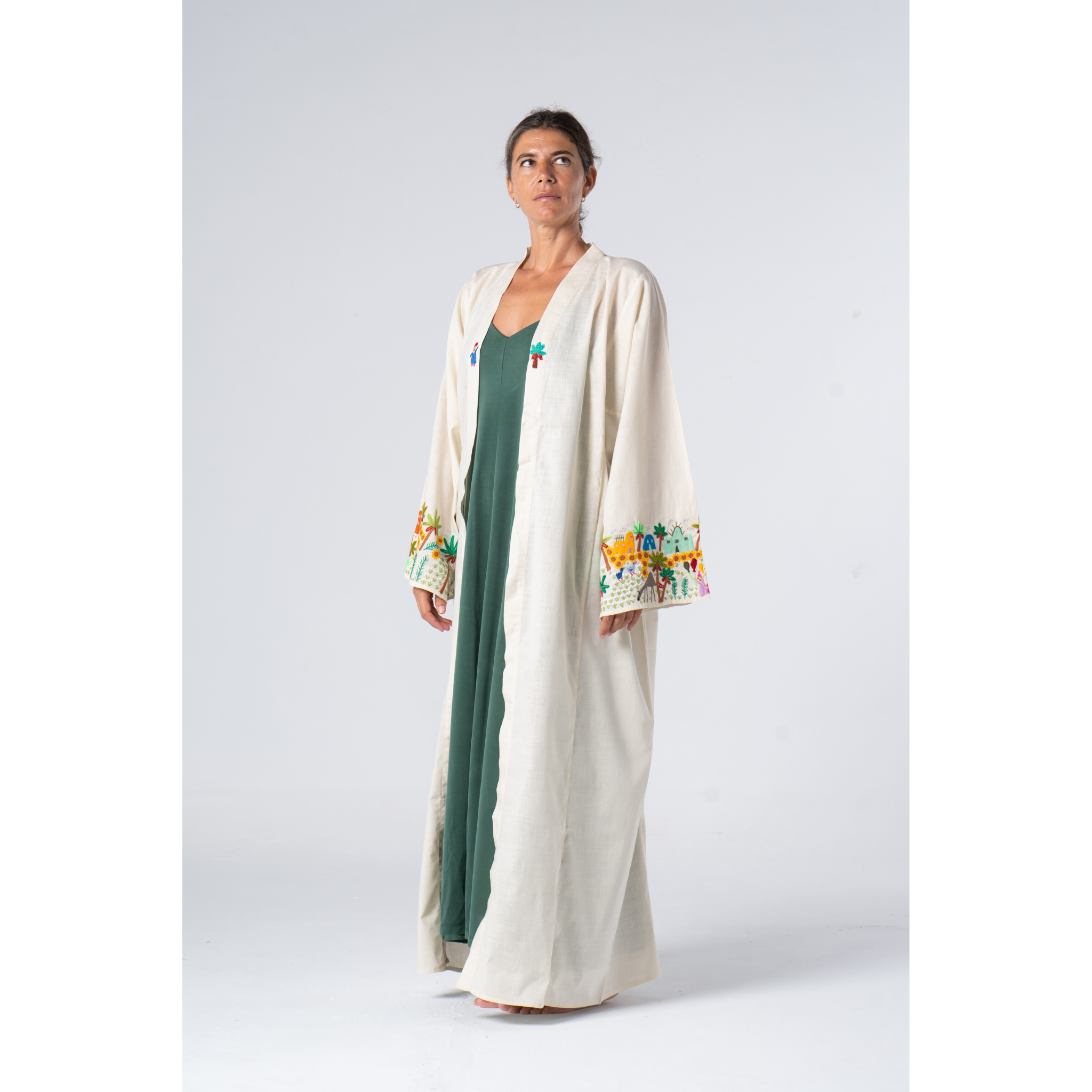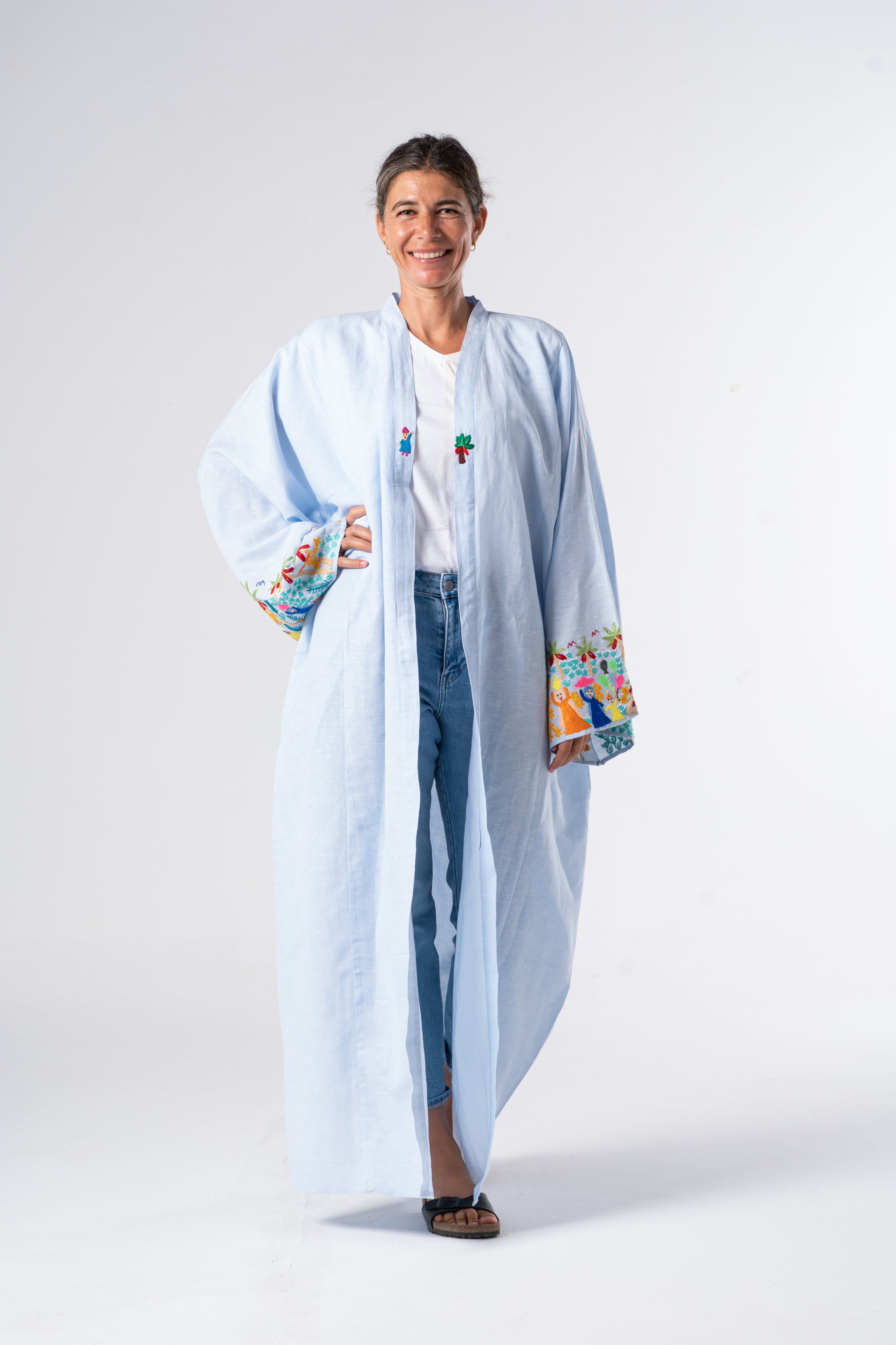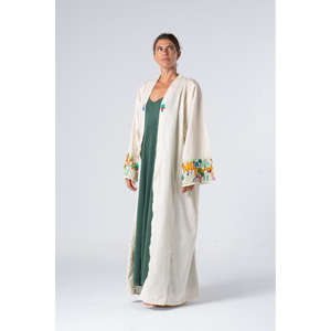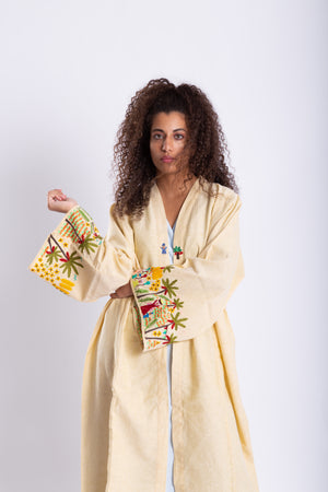 Kaftan with Fellahy embroidery depicting scenes from the Egyptian countryside. Nevin was inspired to create the Fellahy design through her travels through the Nile Delta. She hand draws the scenes of daily life on the fabric which is then embroidered by the women on our team who live and work from all corners of Egypt.