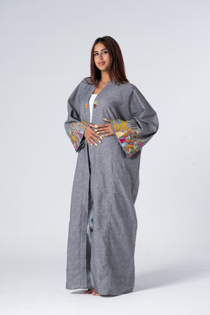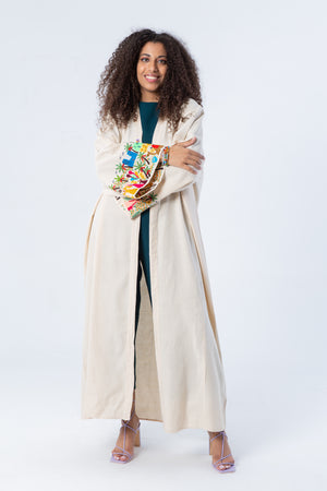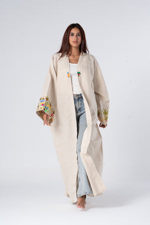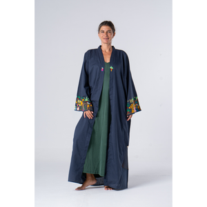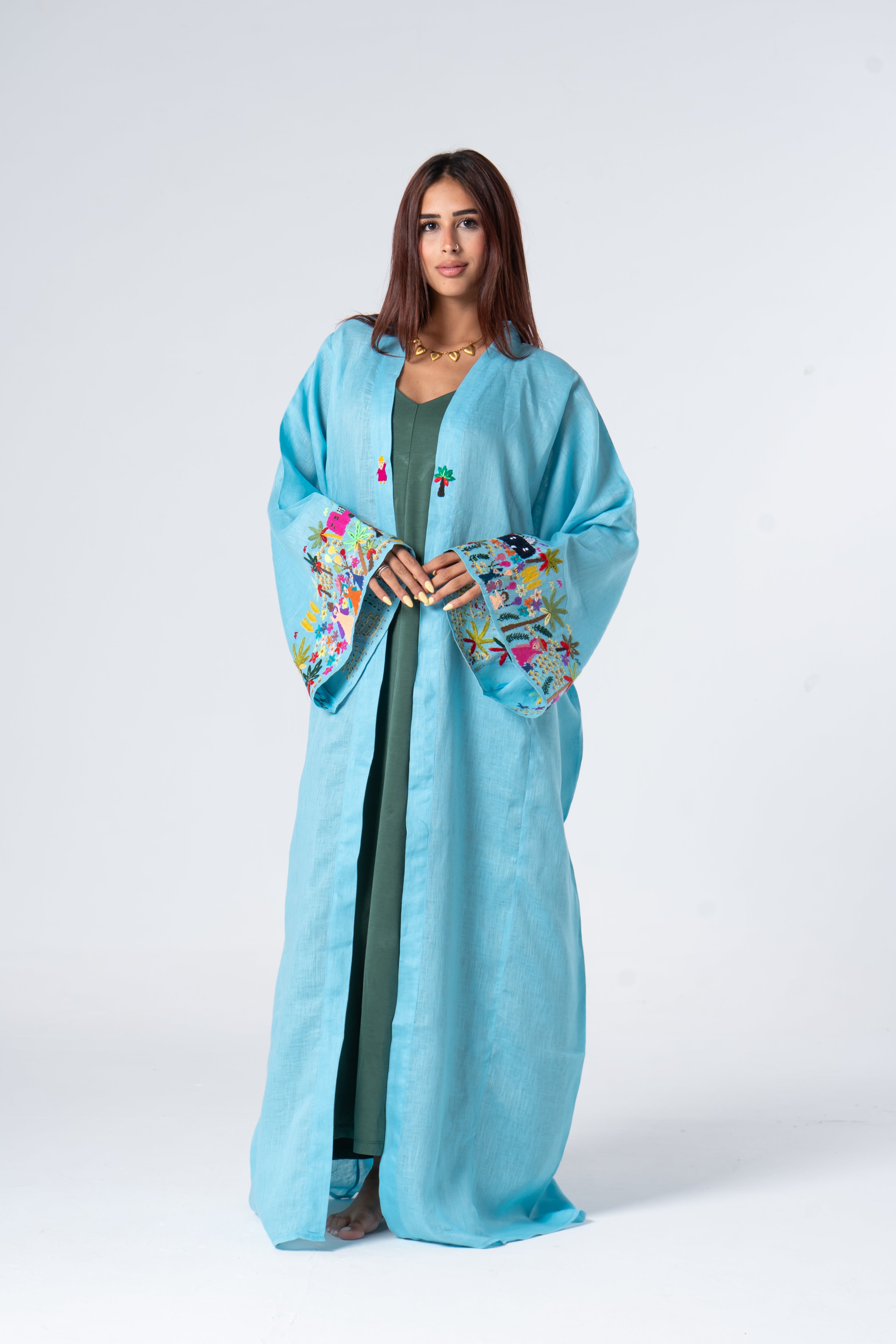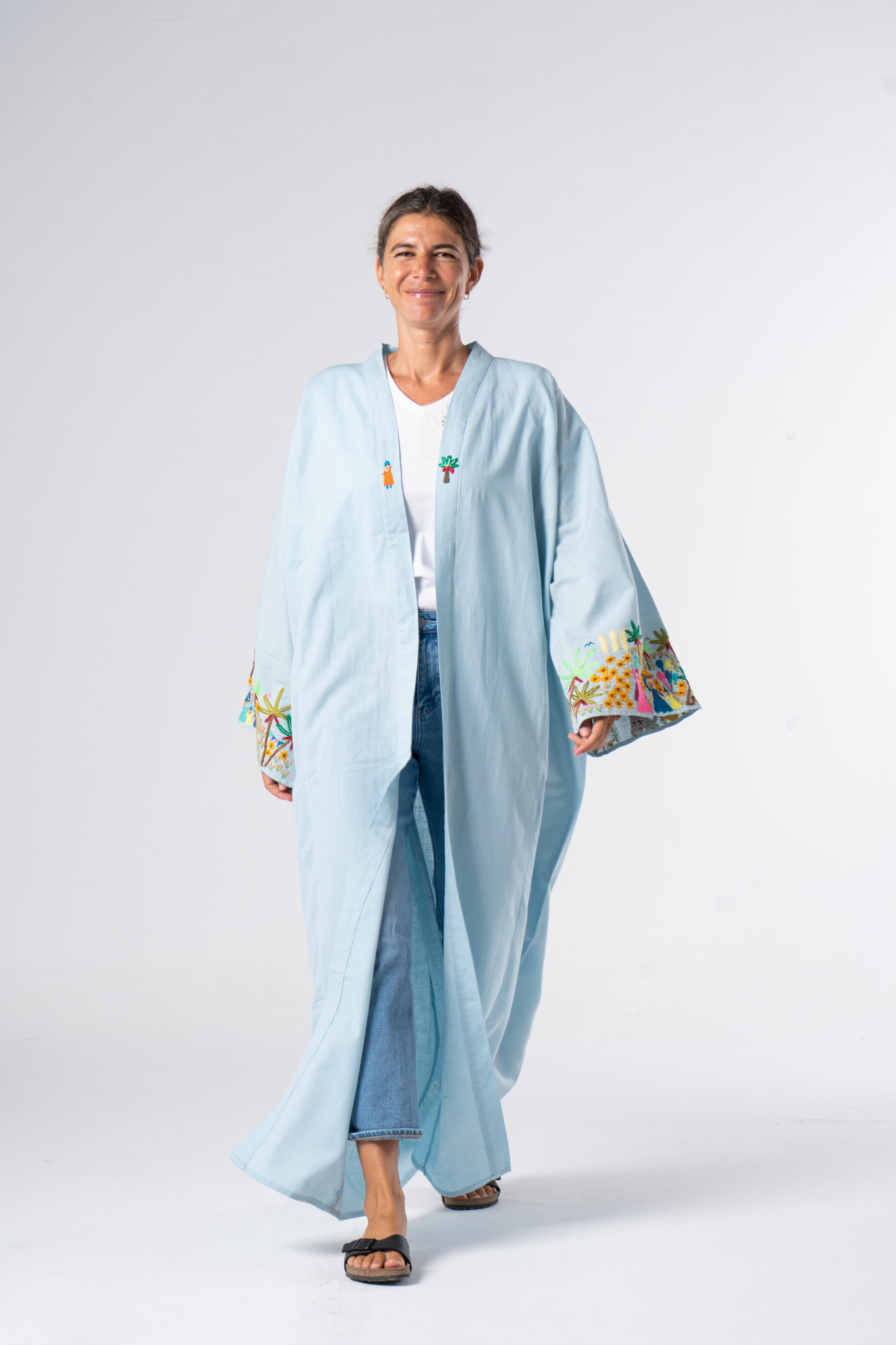 Kaftan with Fellahy embroidery depicting scenes from the Egyptian countryside. Nevin was inspired to create the Fellahy design through her travels through the Nile Delta. She hand draws the scenes of daily life on the fabric which is then embroidered by the women on our team who live and work from all corners of Egypt.