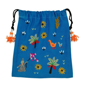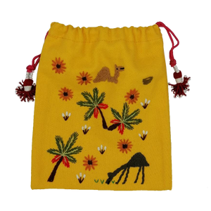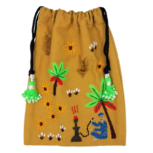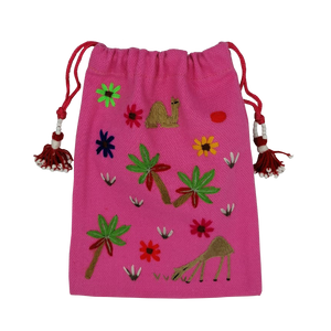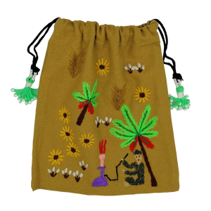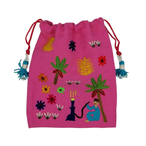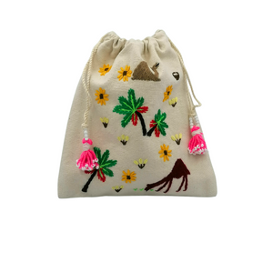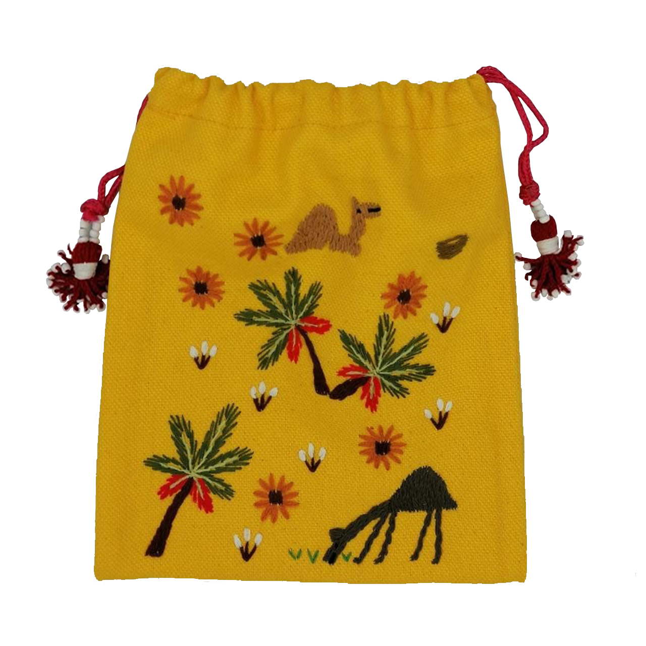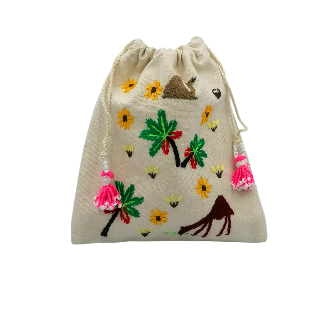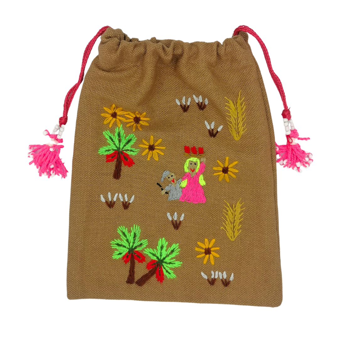 These colorful little pouches are handmade by Egyptian women. The design is hand-drawn by Nevin and was inspired by daily life in the Egyptian countryside