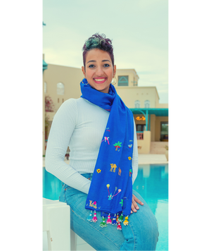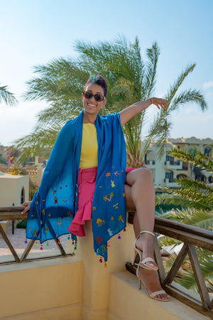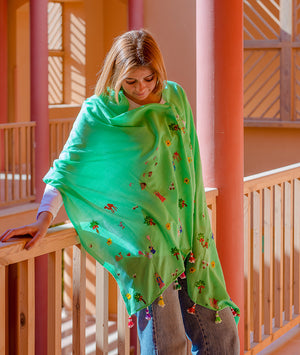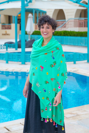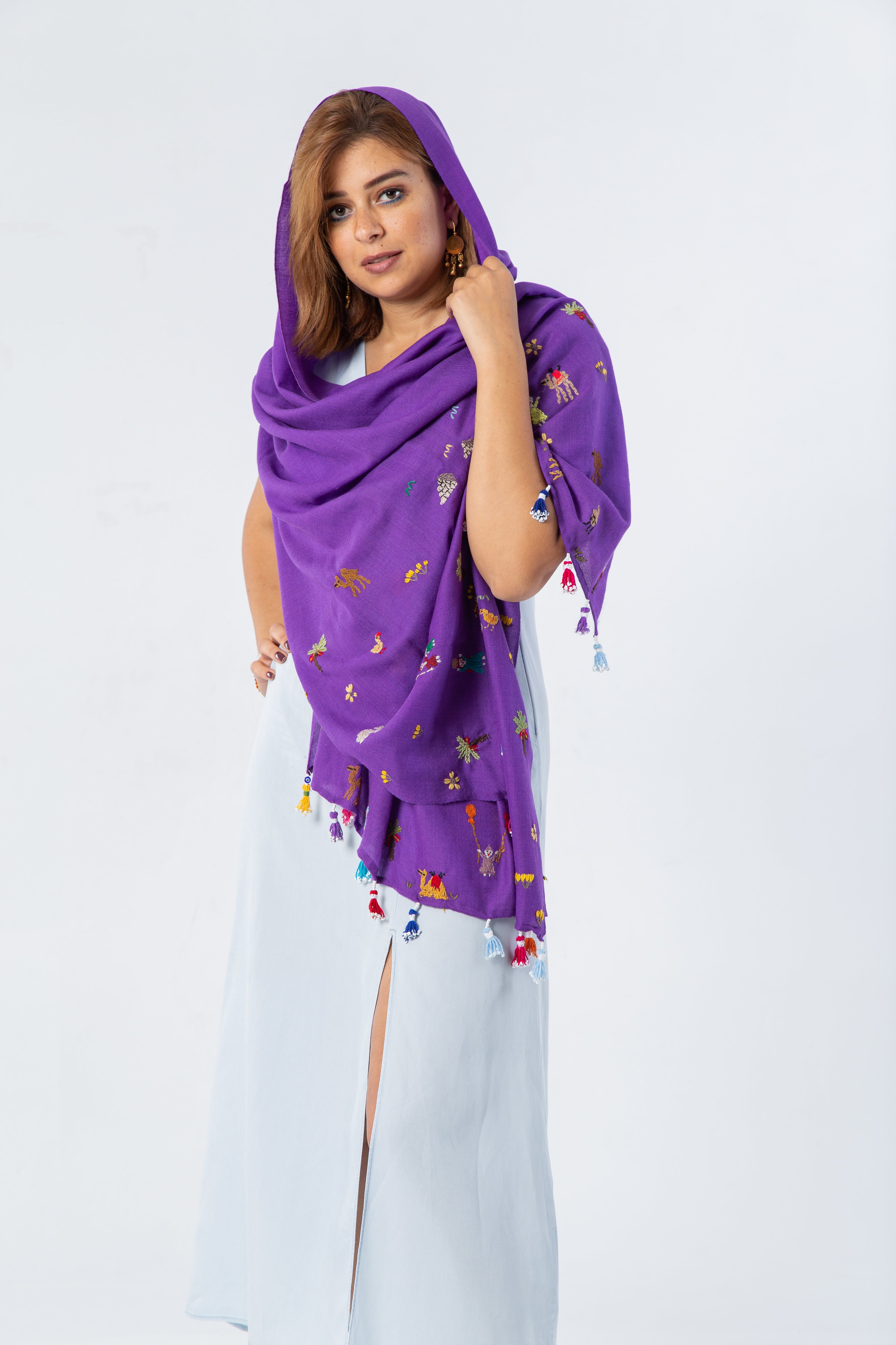 This super soft Indian cashmere shawl was hand embroidered in the Nile Valley. It shows different elements and details from the Egyptian countryside. It will make you feel like you are wrapped in beautiful art.