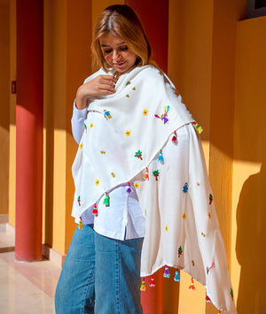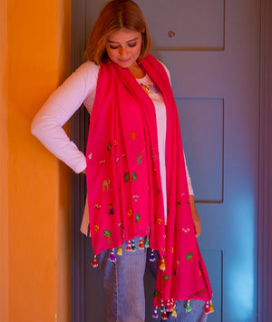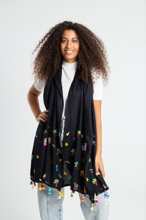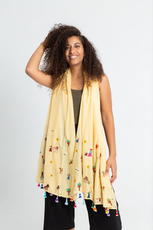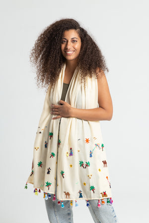 This super soft Indian cashmere shawl was hand embroidered in the Nile Valley. It shows different elements and details from the Egyptian countryside. It will make you feel like you are wrapped in beautiful art.